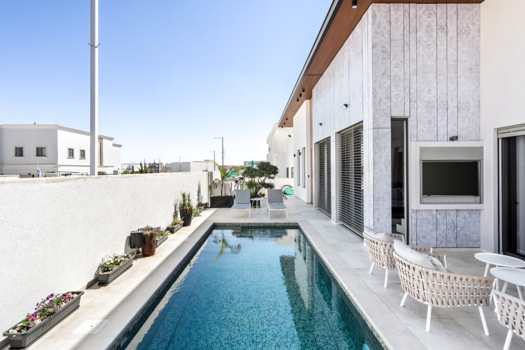 תכנון מייקאובר מקצה לקצה , וילה בנויה ב-6 מפלסים ובריכת שחיה. מיקום: יבנה מגרש 700 מ”ר|בנוי 300 מ”ר