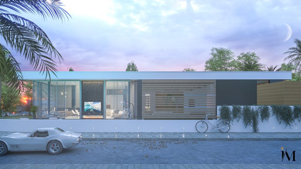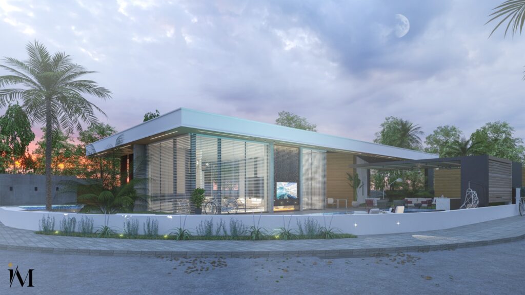 תכנון וילה במדבר במפלס 1 עם בריכת שחיה הפונה לכיוון מטע תמרים רחב ידיים. מיקום: עין תמר, ים המלח. מגרש 800 מ”ר| בנוי 300 מ”ר